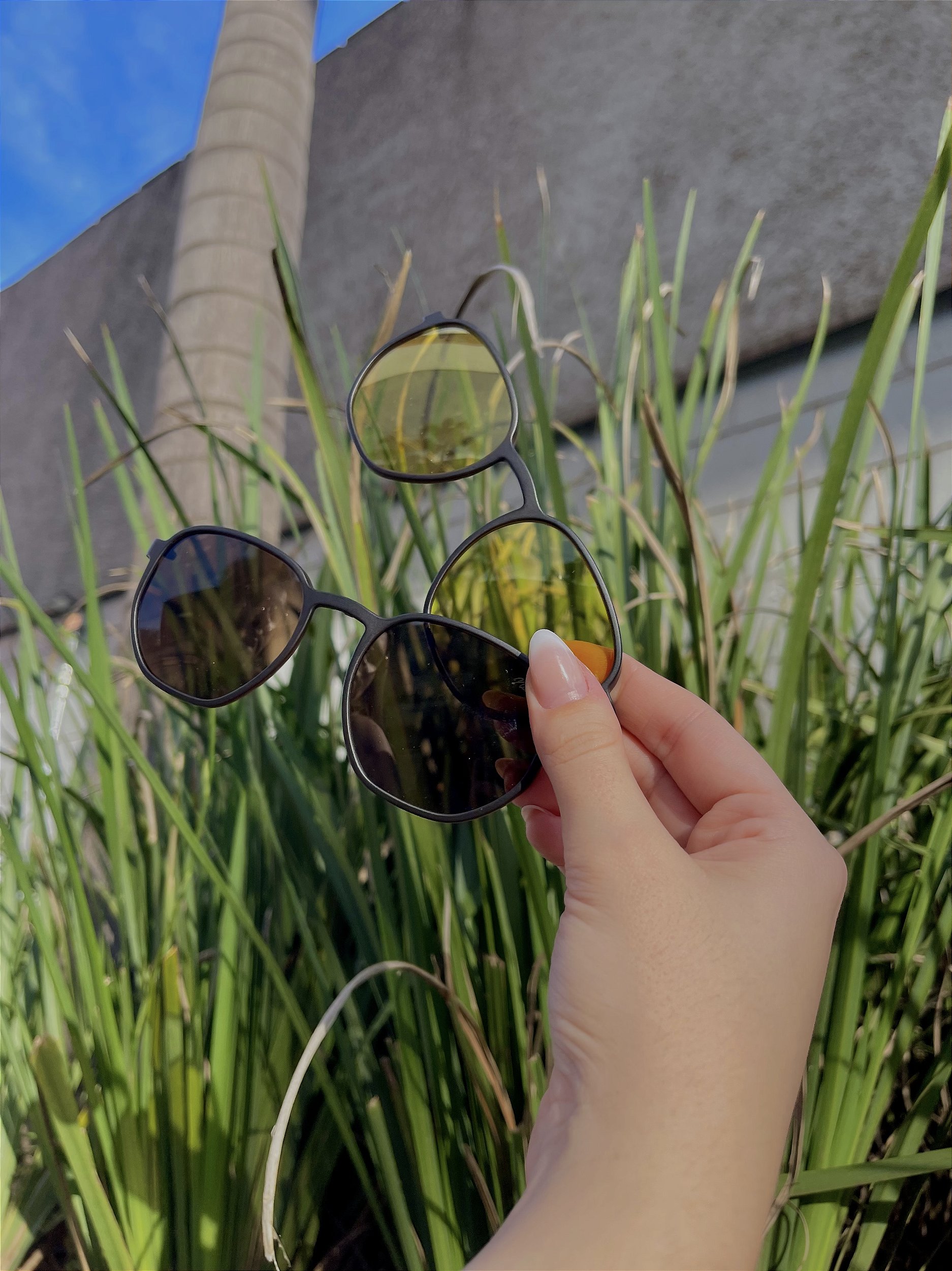 O modelo conta com o sistema 3 em 1 com clip solar magnético, permitindo transformar rapidamente os óculos de grau em óculos de sol, oferecendo praticidade para o dia a dia.